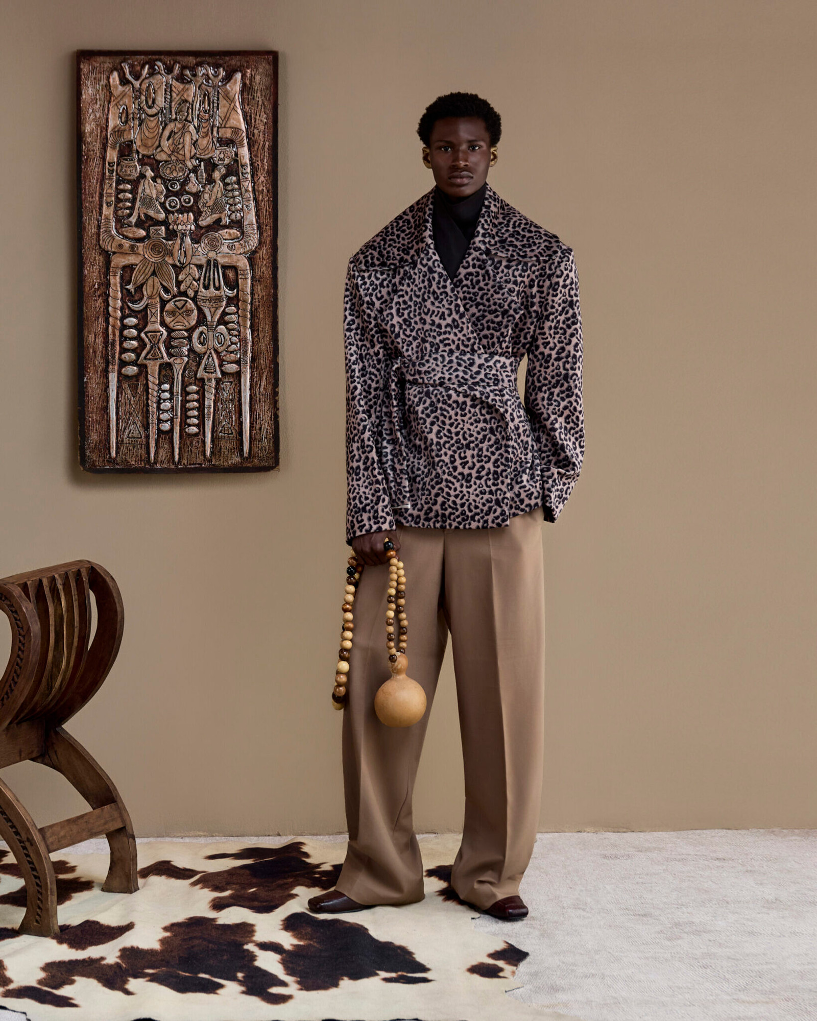 The leopard-print jacket draws inspiration from the leopard skins traditionally worn by warriors as a symbol of strength and leadership.