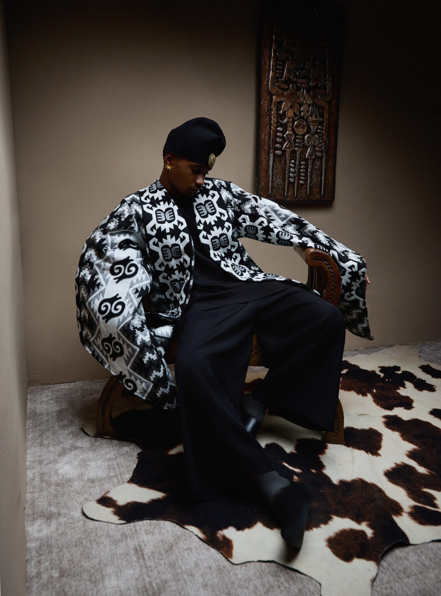 Inspired by the strength and symbolism of ekike ndi ichie, this look embodies authority and power. Bold and intentional, it is crowned with Mekallia Lion Hat-a statement of dominance and heritage.