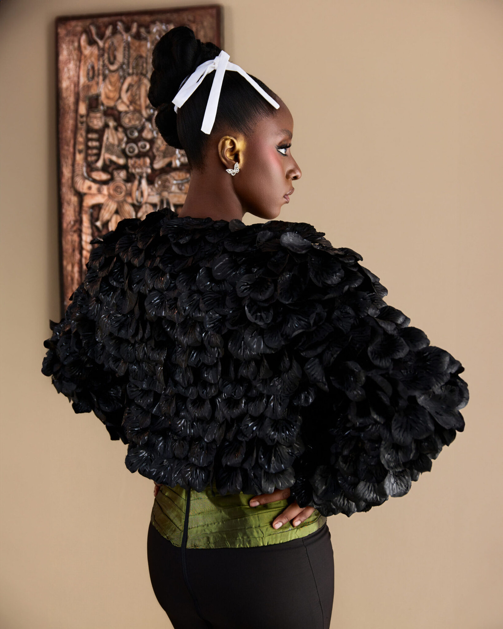 The jacket features over 700 hand-painted black flowers, individually stitched to create depth and texture. Subtle touches of white flowers are added to signify purity and balance.